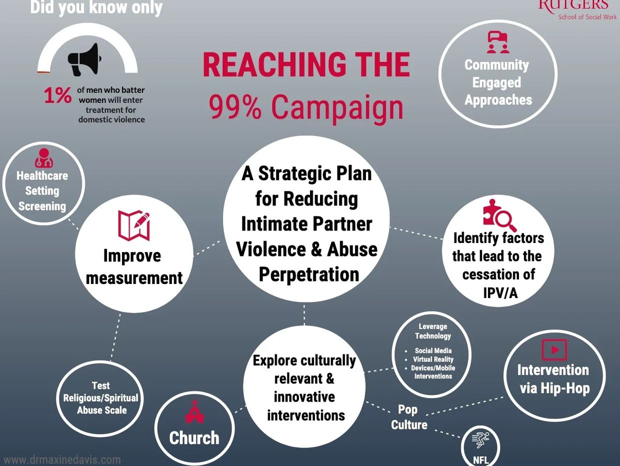 The image above details the research agenda set forth by Dr. Davis, which is executed by partners within or connected to the "Reaching The 99%" lab. Each prong included in the diagram has dynamic potential to contribute to the overarching mission of the central foci. Supported by the Center for Research on Ending Violence.